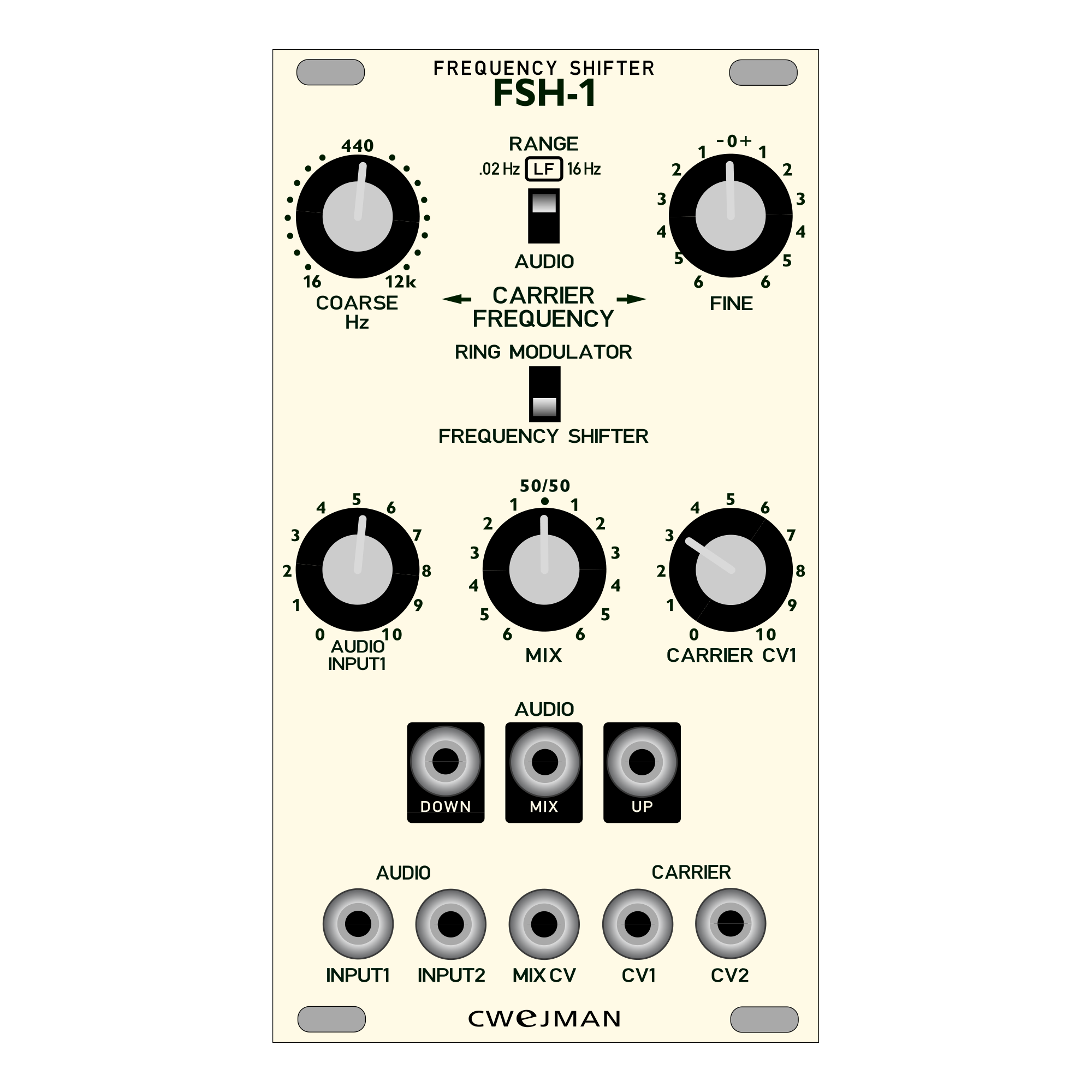 COARSE, FINE and external CV signals (CARRIER CV). The carrier generators outputs are pure sine waveforms with 90 degrees delay between them. Outputs are patched to both ring modulators inputs. Two ring modulators (dual balanced multipliers) receives 0 and 90 degrees shifted carrier and audio signals . The outputs from the multipliers are combined in two ways; the frequency shift UP and DOWN. The frequency shifted audio signal is a sum (UP) or difference (DOWN) of the carrier generators frequency (a pure sine waveform) and all audio signals frequencies (fundamentals and harmonics). The FSH-1 works in two modes; as frequency shifter and as dual ring modulator. A ring modulator is a classic audio effect device and due to the non-harmonic character of the output signal. It's very useful to create metallic timbres such as bells, sweeping whistles and percussive sounds and tremolo effects. The obvious effect (particularly in LF mode) is a stereo panning effect of audio signal.